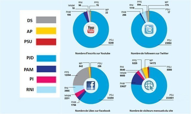 Une récente étude, menée par la radio Houna-Amsterdam et publiée le 18 juin 2013, a révélé une dominance remarquable du Parti de la justice et du développement (PJD) sur Internet. En effet, la présence des autres partis regroupés sur la toile ne dépasse pas 20% !