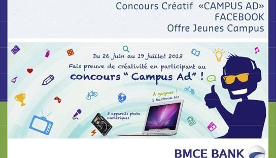 Le concours « Campus Ad » est mis en ligne sur la page facebook de la BMCE Bank du 26 juin au 19 juillet 2013. Il invite les jeunes talents créatifs de cette communauté à élaborer une publicité créative sur sa nouvelle offre bancaire destinée aux jeunes étudiants intitulée Jeune Campus, qu’elle soit vidéo, audio, image, flash ou texte.
