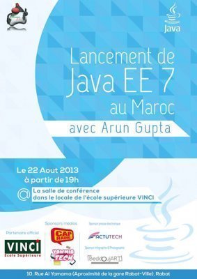 Le Morocco Java User Group (JUG) organise le 22 août 2013 à partir de 19H, à l’école supérieure Vinci, le lancement officiel de JavaEE 7 avec Arun Gupta, passionné de technologie Java, auteur et membre de la communauté qui travaille pour Oracle Corp.