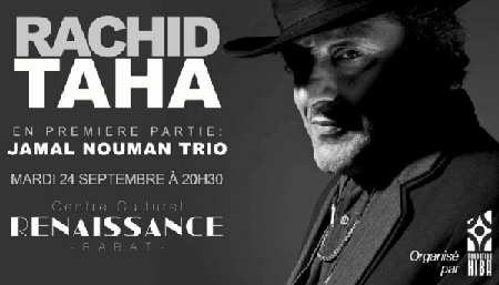 Dans le cadre de la tournée pour la promotion de son 9e album «Zoom», Rachid Taha se produira à Rabat le 24 septembre à 20h30 au Centre culturel renaissance. Le concert est organisé par la fondation Hiba. Les billets sont au tarif unique de 200 DH, en vente dans le réseau des Cafés Carrion et au Centre culturel renaissance à partir du 12 septembre.
