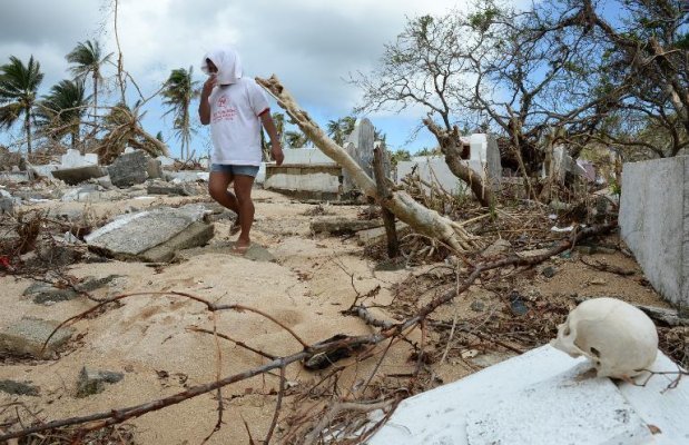 Des crânes décharnés, une main affleurant dans un fatras de pierres tombales brisées: le vent et la mer ont déterré les morts dans le cimetière de Hernani, un village du centre des Philippines meurtri par le typhon Haiyan.
