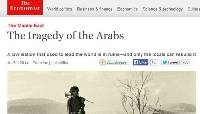 Pour The Economist, la tragédie des Arabes en 2014 peut tout d’abord se résumer à deux constats: il y a 1.000 ans Damas, Bagdad et Le Caire étaient des capitales leaders ; aujourd’hui, tout le monde avance, toutes les régions du monde progressent, excepté le monde arabe. "Malgré les espoirs d’il y a trois ans quand une vague de contestation traversa la région et balaya quatre dictateurs en Tunisie, en Egypte, en Libye et au Yémen (…) écrit le magazine britannique, les fruits du Printemps arabe se sont transformés en autocratie et en guerre". Ceux-ci engendrent de la misère et du fanatisme qui menacent le reste du monde, poursuit The Economist.