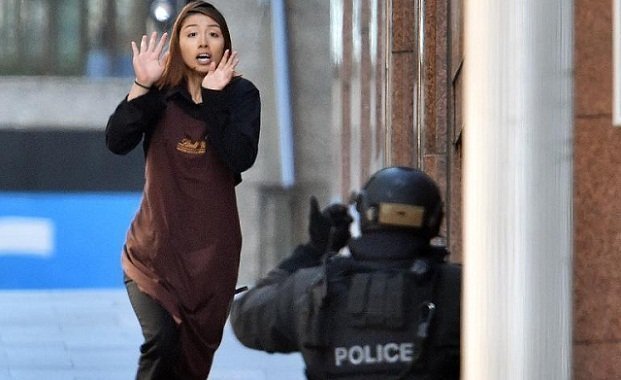 Des centaines de policiers en armes encerclaient le Lindt Chocolat Cafe, où des otages tenaient plaqué contre une fenêtre un drapeau noir avec une inscription partiellement visible en caractères arabes. Il semblerait qu'il s'agisse de la shahada, ou profession de foi musulmane: "Il n'y a de Dieu qu'Allah et Mahomet est son prophète".