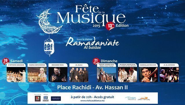 Casablanca démarre la saison estivale en musique. Les 20 et 21 juin 2015, la ville blanche organise sa 3e étition de la fête de la musique sous le thème: "Ramadaniates Al Baidae". Une programmation ramadanesque familiale et classique avec des artistes marocains de renom.