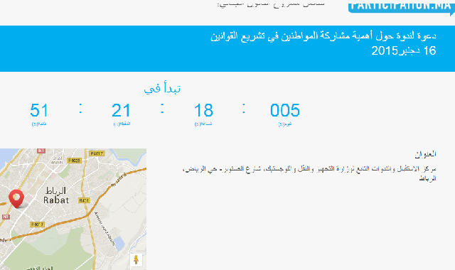 Pour introduire officiellement le portail, ICT4Dev organise une conférence ouverte au grand public le 16 décembre sur l’importance de la participation des citoyens à l’élaboration des lois. L'événement se tiendra au Centre d’accueil et de conférence du ministère de l’Equipement, en présence d’acteurs des secteurs privé et public et de la société civile.