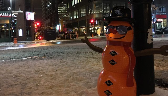 Les principales artères de Montréal étaient enjolivées le 13 janvier dernier par des centaines de bonshommes de neige orange.