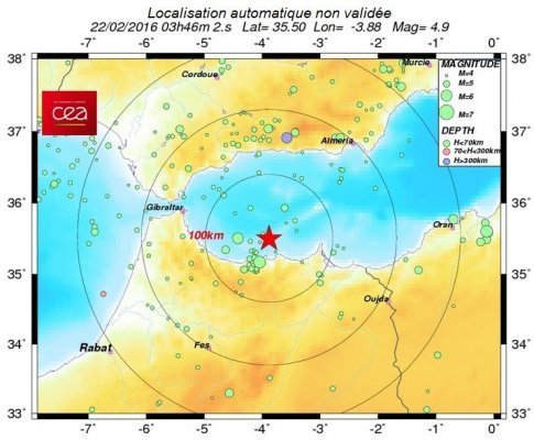 Différents observatoires internationaux ont signalé cette secousse, qui a eu lieu à 67 km au nord-nord-est d'Al Hoceima, en pleine Méditerranée, à 10 km de profondeur et qui a été d'une magnitude de 5,4 degrés sur l'échelle de Richter.