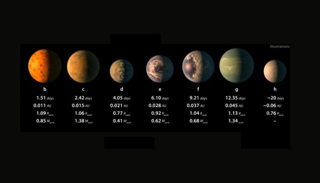 Les sept planètes, qui pourraient avoir des températures assez proches de celles de la Terre, sont actuellement nommées de b à h (voir photo).