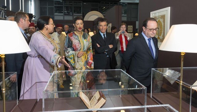 La Princesse Lalla Meryem et le président français François Hollande ont présidé, mercredi 22 mars à Paris, le vernissage de l’exposition "Splendeurs de l’écriture au Maroc, manuscrits rares et inédits", qui se tient du 23 mars au 6 avril à l’Institut du monde arabe (IMA).