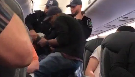 Des cris indignés retentissent sur les vidéos mises en ligne par des passagers, montrant le moment où trois policiers s'approchent d'un homme déjà installé dans son siège. Ce dernier commence à hurler lorsque l'un des agents le saisit de force et se cogne apparemment sur le repose-bras avant d'être traîné au sol jusqu'à la sortie.