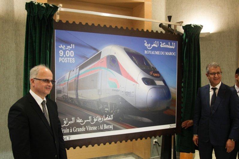 Mohamed Rabie Khlie, DG de l'ONCF, et Amin Benjelloun Touimi, DG du groupe Barid Al-Maghrib, ont lancé jeudi 21 mars le timbre-poste édité à l’effigie du train à grande vitesse "Al Boraq".