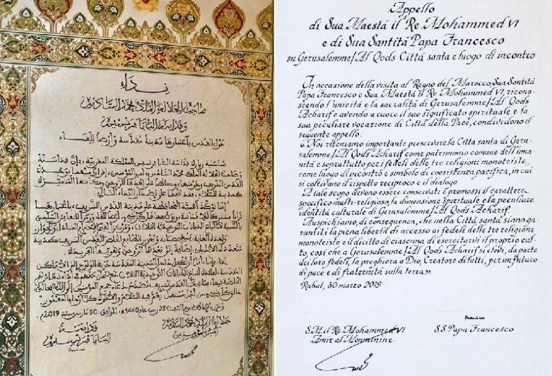 " A l'occasion de la visite au Royaume du Maroc, Sa Sainteté le Pape François et Sa Majesté le Roi Mohammed VI, Commandeur des Croyants, reconnaissant l’unicité et la sacralité de Jérusalem / Al Qods Acharif et ayant à cœur sa signification spirituelle et sa vocation particulière de ville de la Paix, partagent l’Appel Suivant :