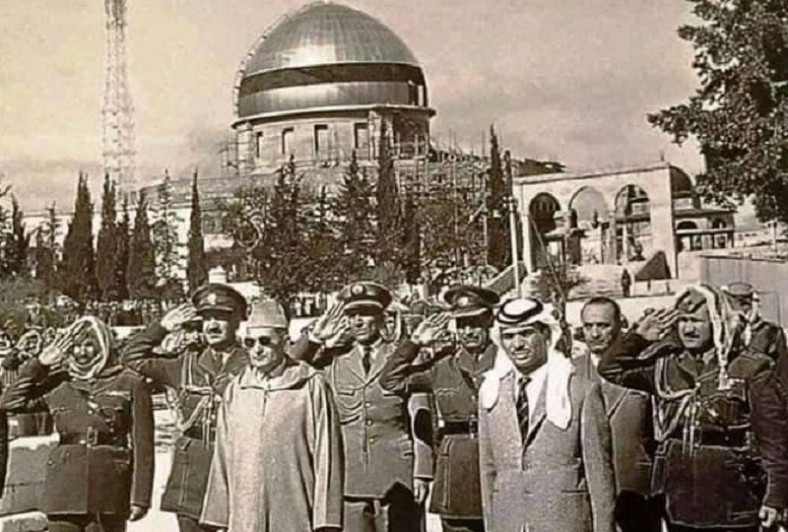 La première les montre devant le dôme du Rocher, posant avec le Roi Hussein de Jordanie, et une délégation militaire jordanienne ainsi qu'un civil marocain non identifié.