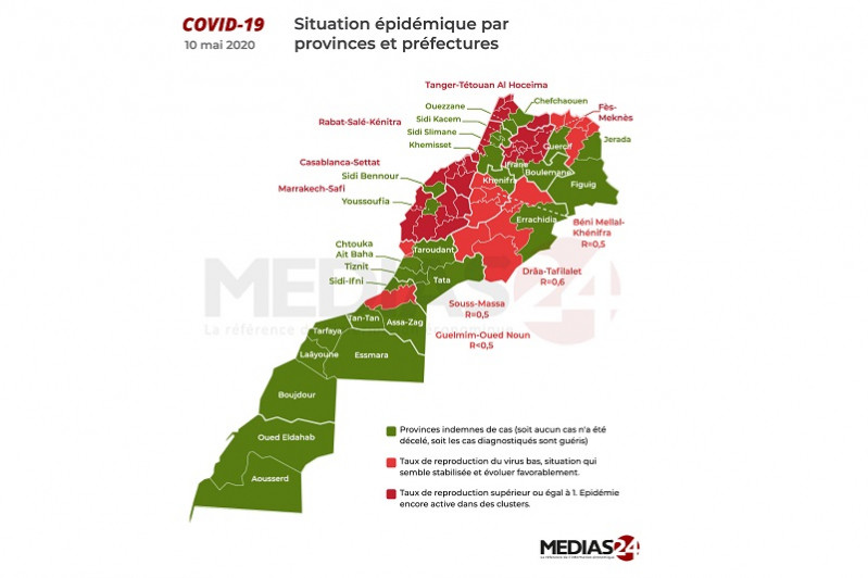 Il reste 4 provinces relevant des régions Casablanca-Settat et Rabat-Salé-Kénitra que nous maintenons en vert mais avec des réserves: Sidi Bennour, Sidi Kacem, Khemisset et Sidi Slimane. Nous les maintenons entre parenthèses puisque les dernières données les concernant remontent au 5 mai.