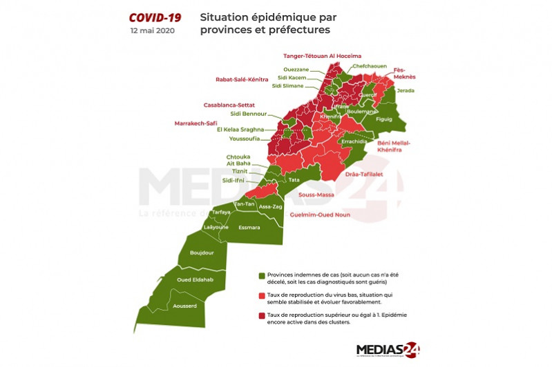 Toutes les directions régionales de la Santé ont publié le mardi 12 mai leurs données détaillées. La direction régionale de Rabat-Salé-Kénitra a publié à cette occasion sa première mise à jour depuis le 5 mai. Nous avons découvert à cette occasion que la province de Khemisset, auparavant indemne, comprend désormais 14 cas actifs. Le nombre de provinces vertes retombe désormais à 26 sur 75. Parmi les provinces en rouge, plusieurs ne comptent plus qu'un seul cas actif.