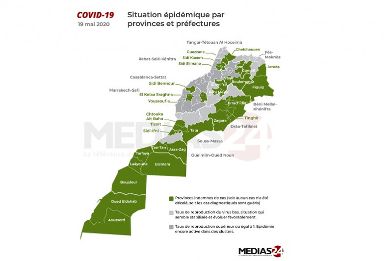 Les zones vertes sont inchangées, 30 provinces sur 75. La région de Casablanca-Settat a publié des données détaillées le 19 mai dans la soirée. C'est dans cette région qu'ont été annoncés mardi 19 mai le plus grand nombre de cas.