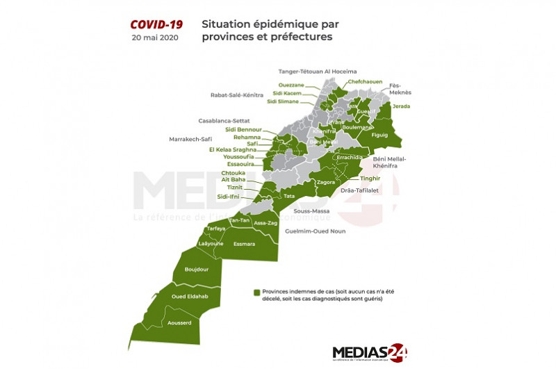 33 provinces au total sur 75 sont désormais en zone verte. Les nouvelles provinces indemnes sont Rhamna, Safi et Essaouira. Voici la situation par province selon les dernières données publiées à l'échelon local au mercredi 20 mai à 16H.