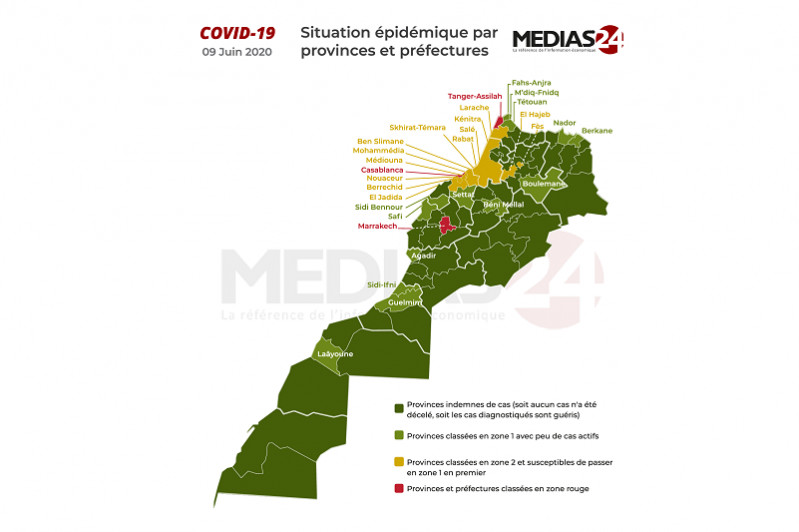 59 provinces et préfectures sont désormais classées en zone 1. Ce sont celles sans-Covid ou avec très peu de cas. Médias24 adopte à compter de ce jour, le code couleur du ministère de l'Intérieur: le vert pour la zone 1, l'ocre pour la zone 2 et le rouge pour les trois grandes villes où il persiste le plus grand nombre de cas (Casablanca, Tanger et Marrakech) où les restrictions seront probablement allégées en dernier.
