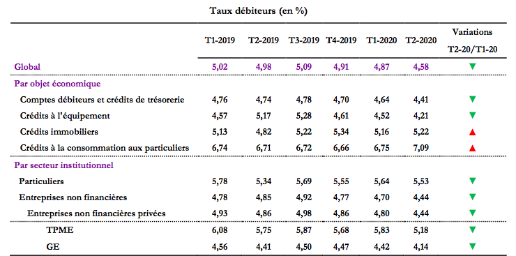 Par objet économique, les taux ont reculé de 23 pbs pour les facilités de trésorerie et de 31 pbs pour les crédits à l’équipement.