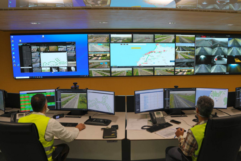 La salle de contrôle est dotée d’équipements et de solutions technologiques de dernière génération et connectée à l’ensemble des équipements installés sur le réseau: caméras, stations de comptage de trafic, panneaux d’information, … Elle permet la supervision du trafic du réseau autoroutier national à distance et d’une manière centralisée, le pilotage automatique et en temps réel des équipements du terrain, la communication et la coordination avec les différents intervenants sur le terrain et la production de l’information à la portée de toutes les parties prenantes pour une efficacité et rapidité dans les prises de décisions.