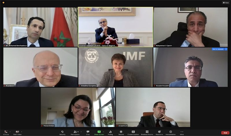 En marge des réunions de printemps de la Banque mondiale et du Fonds monétaire international (FMI) qui se sont déroulées virtuellement, du 9 au 11 avril 2021, Mohamed Benchaaboun, Ministre de l’Economie, des Finances et de la Réforme de l’Administration, et Abdellatif Jouahri, Gouverneur de Bank Al-Maghrib ont tenu, le vendredi 16 avril 2021, une réunion virtuelle avec Kristalina Georgieva, Directrice Générale du FMI.