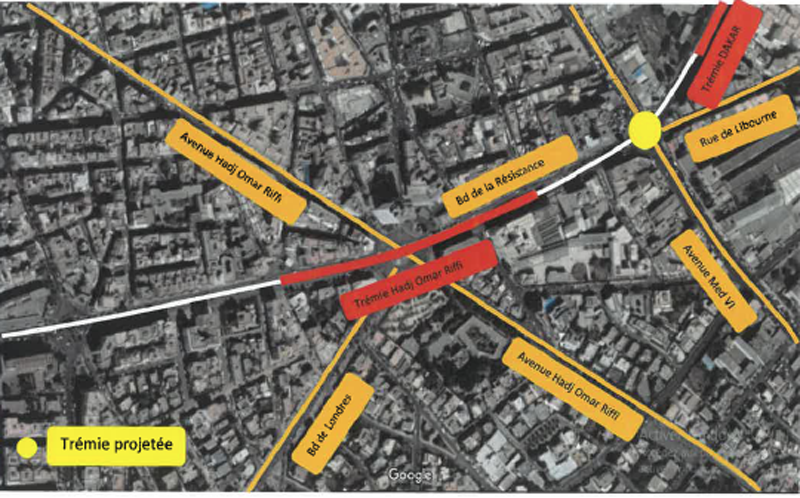 Les prestations doivent prendre en compte le projet de la ligne T3 du tramway qui traverse le carrefour en question, ainsi que les ouvrages existants, à savoir les deux trémies Hadj Omar Riffi (élargissement en 2x2 voies) et Dakar.