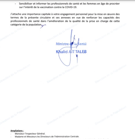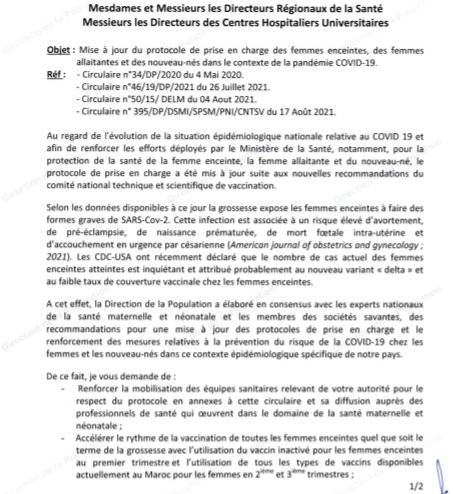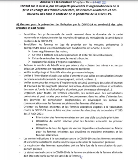 - Accélérer le rythme de la vaccination de toutes les femmes enceintes, quel que soit le terme de la grossesse, avec l'utilisation du vaccin inactivé pour les femmes enceintes au 1er trimestre et l'utilisation de tous les types de vaccins disponibles actuellement au Maroc pour les femmes au 2e et 3e trimestre ;