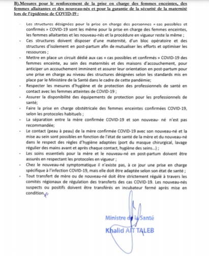 - La mise en place d'un circuit dédié aux femmes enceintes « cas possibles et confirmés », au sein des maternités et des maisons d'accouchement, permettra d'anticiper un accouchement imminent et d'assurer leur orientation en post-partum pour une prise en charge au niveau des structures désignées, selon les standards mis en place par le ministère de la Santé dans le cadre de cette pandémie.