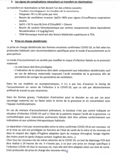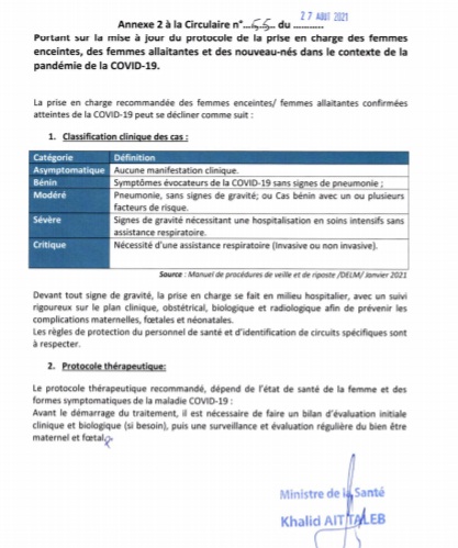 - Les structures désignées pour la prise en charge des personnes « cas possibles et confirmés » sont les mêmes pour celle des femmes enceintes, des femmes allaitantes et des nouveau-nés, et la procédure en vigueur reste la même ;