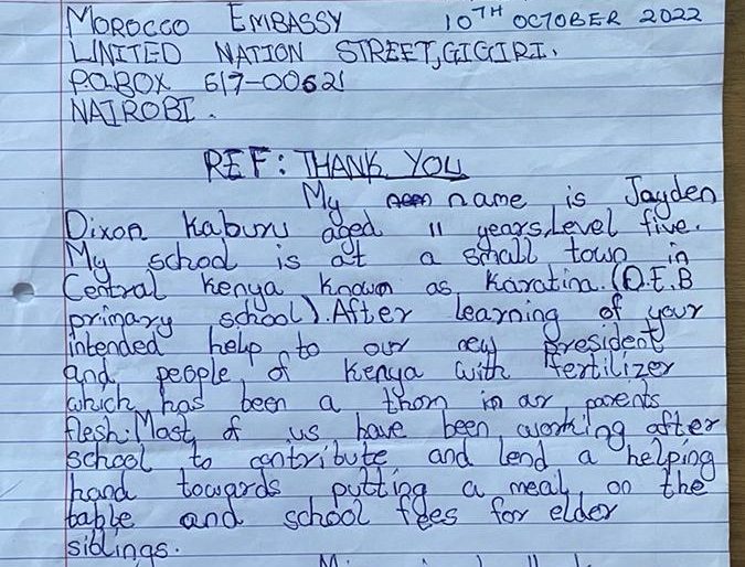 L'ambassade du Maroc au Kenya a reçu, le 12 octobre 2022, une lettre écrite par Jayden Dixon Kaburu, âgée de 11 ans et originaire de Karatina, dans laquelle elle remercie le Roi du Maroc, Mohammed VI, pour les engrais reçus par son pays.