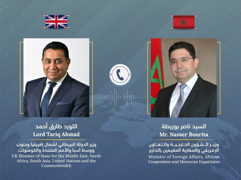 Le ministre des Affaires étrangères, de la coopération africaine et des Marocains résidant à l'étranger a eu, le vendredi 17 février, un entretien téléphonique avec Lord Ahmad Tariq, ministre d’État britannique aux Affaires étrangères pour l’Asie du Sud et du Centre, l’Afrique du Nord, l’ONU et le Commonwealth.