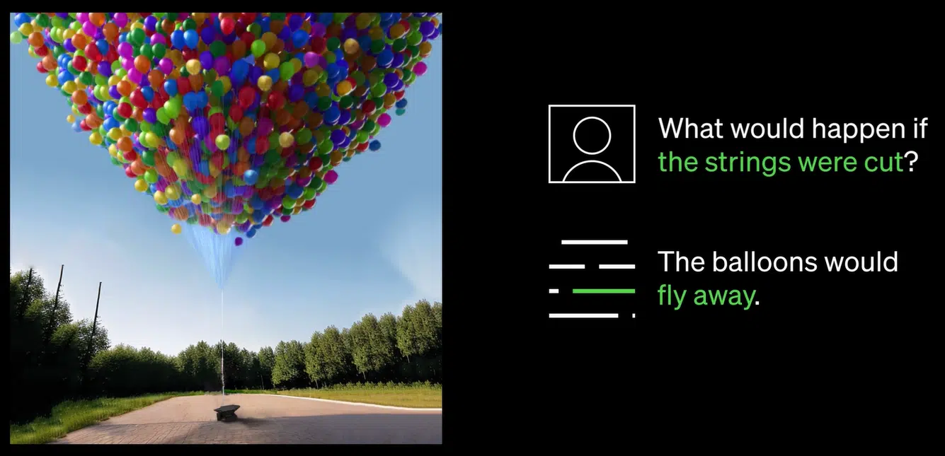 Mais le plus impressionnant est sans doute sa capacité à comprendre les images. Prenons l’exemple d’une image qui montre des ballons à hydrogène liés à des fils. Lorsqu’on lui demande ce qu’il va arriver au ballon si les fils sont coupés, il répond que les ballons vont s’envoler.