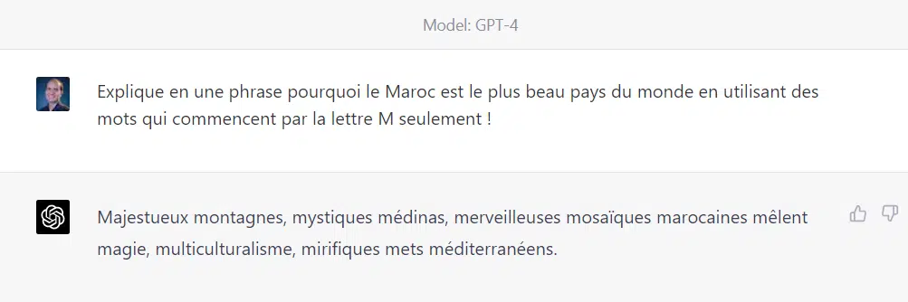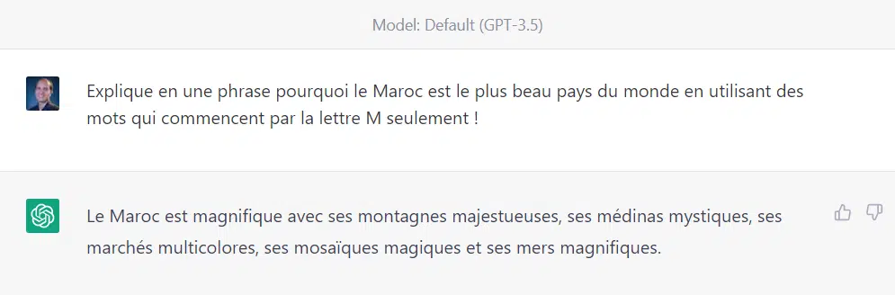 Médias24 s’est pris au jeu. Nous avons fait une requête similaire à l’un des exemples présentés dans la vidéo ci-dessus. Nous lui avons demandé d’expliquer en une phrase "pourquoi le Maroc [était] le plus beau pays du monde", en utilisant des mots qui commencent uniquement par la lettre M. Voici deux types de réponse :