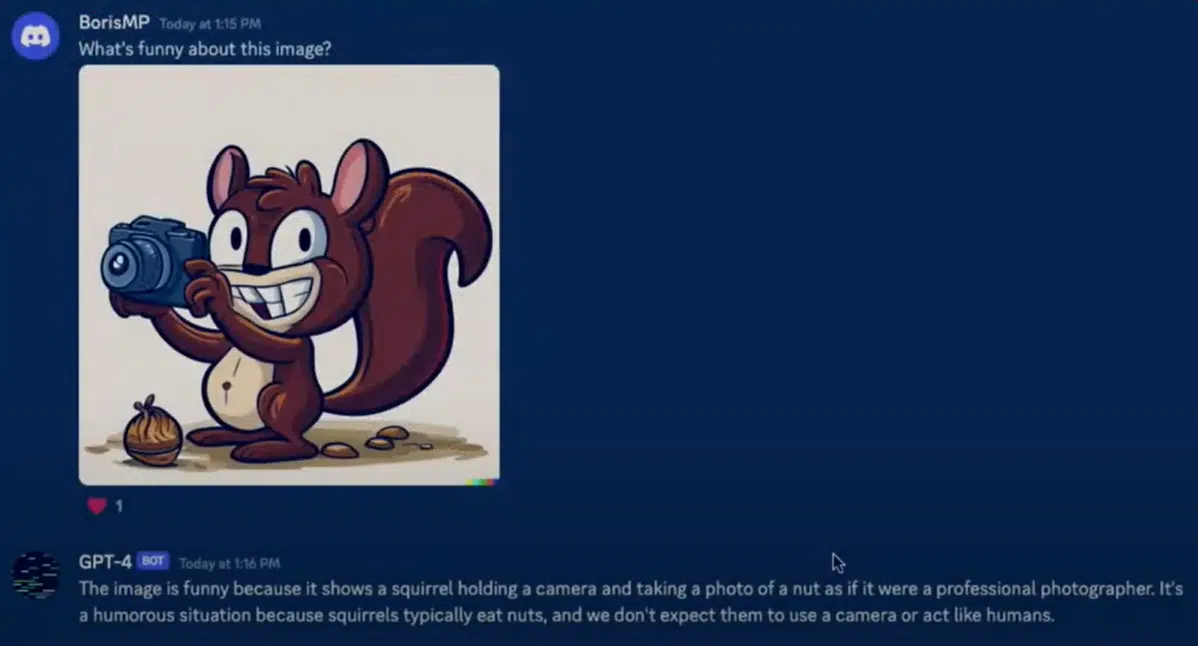 Encore plus impressionnant, il parvient même à comprendre les blagues sous forme de dessin. Lors de la présentation de cet outil en direct, l’un des participants sur Discord a soumis une image avec un écureuil qui photographie une noisette. Le chatbot a compris qu’il s’agissait d’une blague où l’écureuil imite le comportement des humains en prenant des images de nourriture.