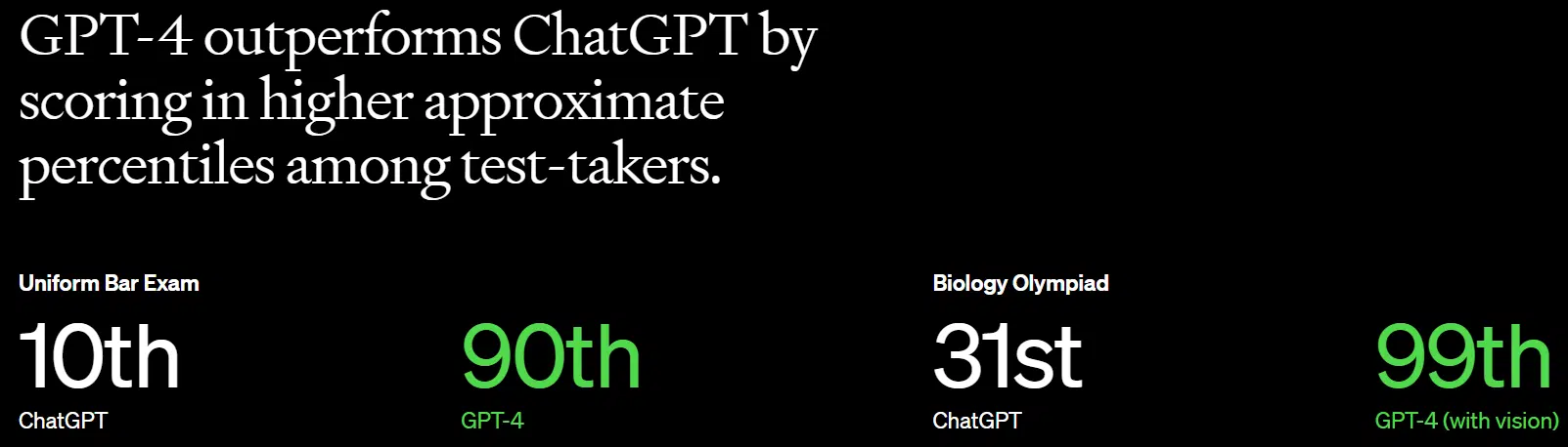 GPT-4 surpasse ChatGPT en fournissant de meilleurs scores dans les tests et concours, comme pour l’examen du barreau ou les olympiades de biologie.