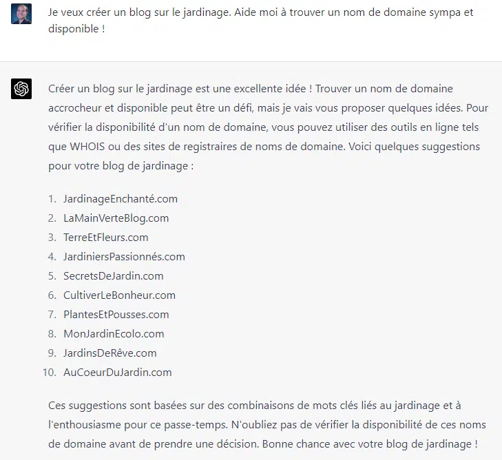 ChatGPT sait faire preuve de créativité. Ici, nous lui avons demandé de trouver un nom de domaine pour un blog dans le jardinage.