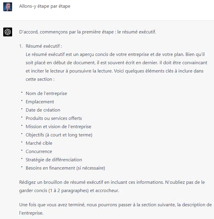 Dans un autre registre, il peut vous guider pas à pas dans une tâche que vous trouvez difficile. Ici nous lui demandons d’élaborer un business plan.
