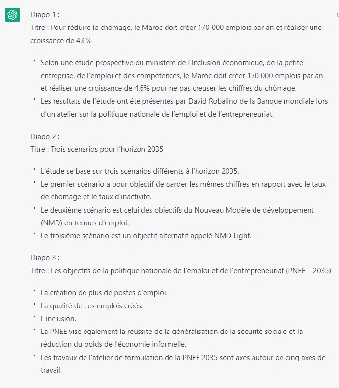 ChatGPT peut aussi vous aider à préparer vos diapos. Il suffit de lui donner le texte et il le transforme en slide. Pour l’expérience, nous lui avons soumis l’un de nos articles à transformer avec l’objectif de créer trois diapos.