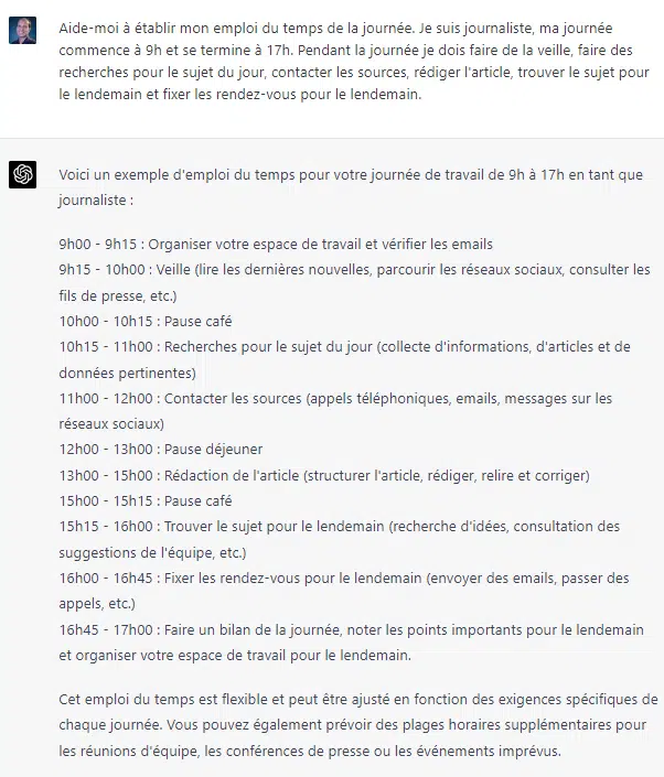 ChatGPT peut vous aider à établir votre emploi du temps de la journée. Il suffit de lui donner les tâches à accomplir pour qu’il vous propose un emploi du temps.