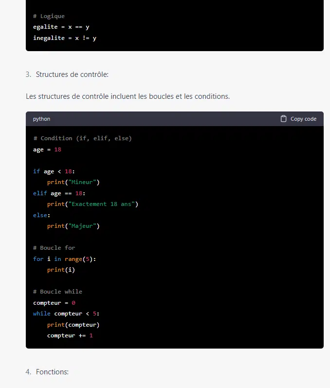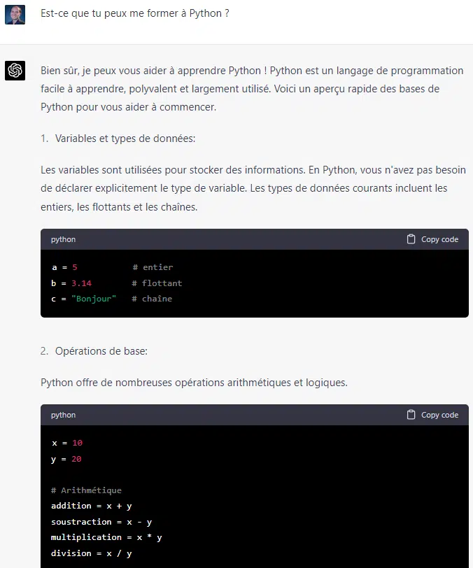 ChatGPT peut aussi se transformer en outil de formation. Il peut proposer de vous former sur des sujet variés, y compris des langages informatiques. Sur la capture d'écran suivante, nous lui avons demandé s’il pouvait assurer une formation sur le langage Python.