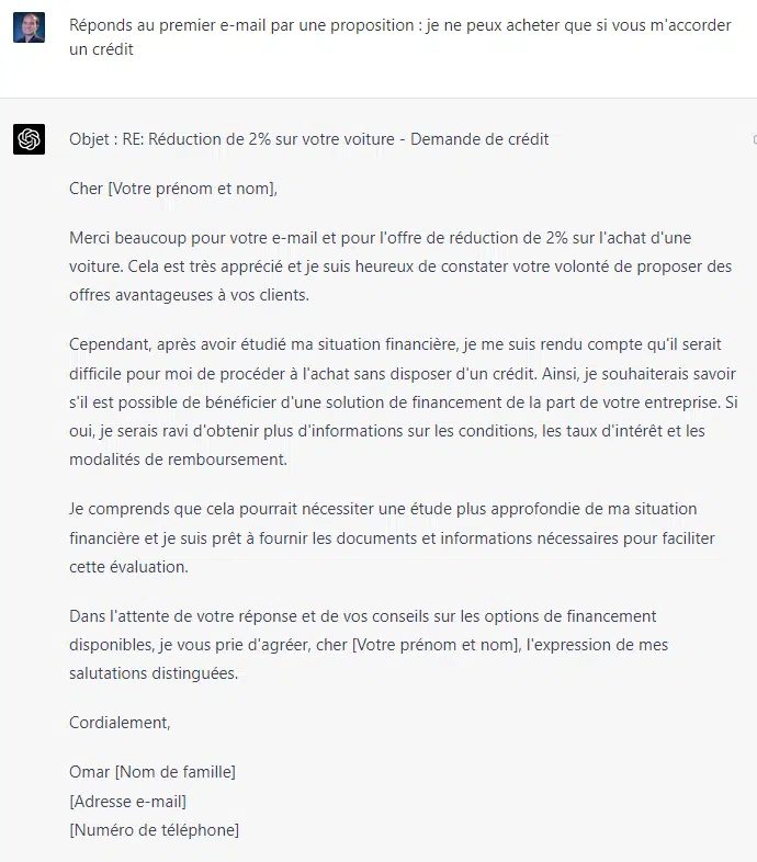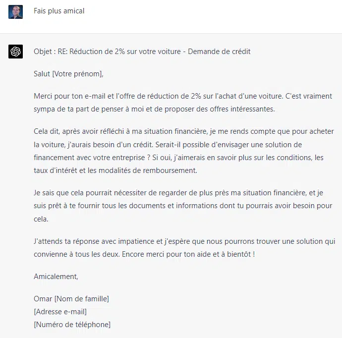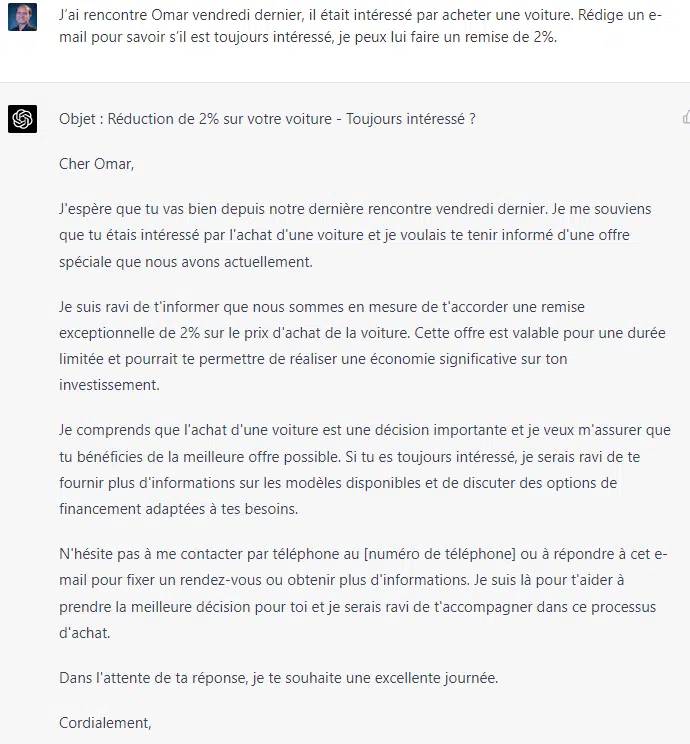 Que ce soit pour rédiger un mail ou y répondre, ChatGPT peut être très efficace et vous faire gagner du temps et vous permettre de vous consacrer à d'autres tâches. Exemple: