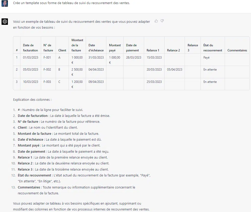 Pour faciliter votre travail ou celui de vos collaborateurs, vous pouvez lui demander de créer des templates à remplir. Exemple avec un tableau de suivi de recouvrement des ventes. Vous pouvez bien évidemment lui réclamer d’ajouter ou de supprimer selon vos préférences.