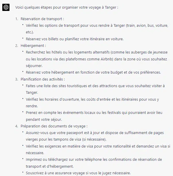 ChatGPT peut aussi vous aider à préparer un voyage. Ici, nous lui demandons de nous aider à préparer un déplacement à Tanger.