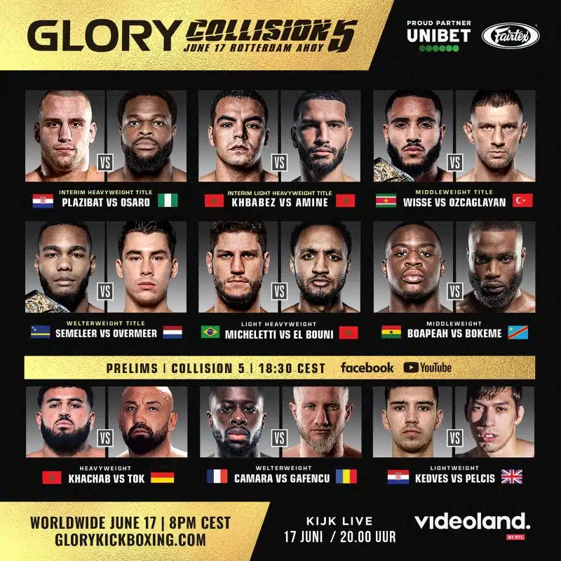 La tête d'affiche de la carte sera un énorme combat pour le titre des poids lourds intérimaire de Glory entre des amis devenus adversaires, Antonio Plazibat (22-4, 16 KO) et Tariq 'Cookie' Osaro (24-2-1, 12 KO).