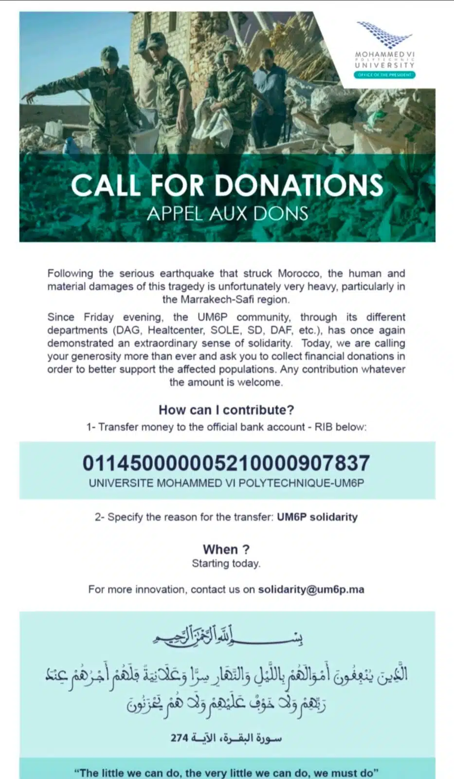- L’Université Mohammed VI a aussi lancé un appel aux dons financiers. Le transfert d’argent peut se faire vers sa banque officielle par le RIB suivant : 011450000005210000907837, et en spécifiant la raison du transfert : UM6P Solidarity.