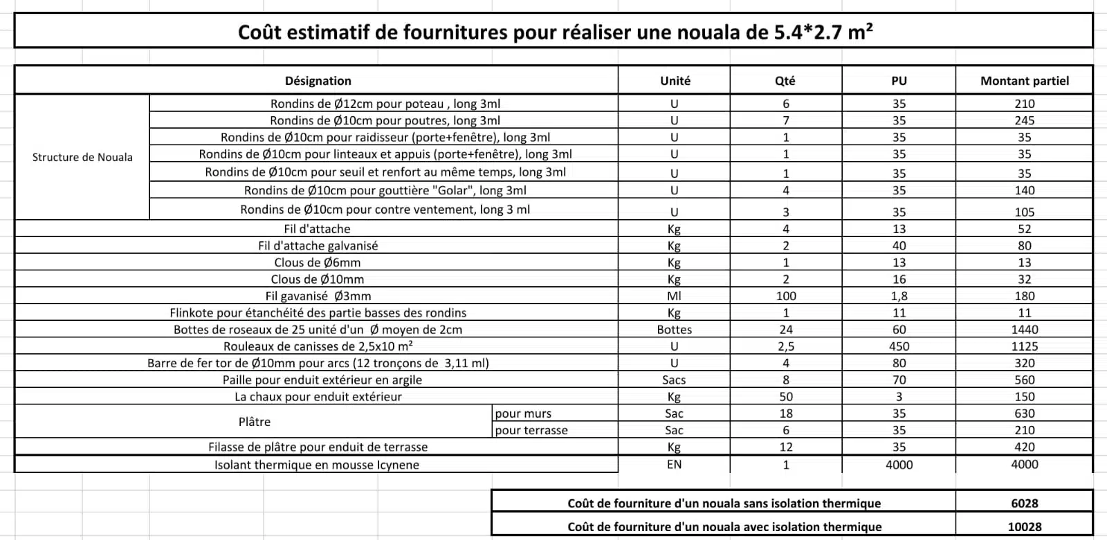 Ci-dessous le coût estimatif des fournitures pour réaliser une nouala de 5,4/2,7 m².