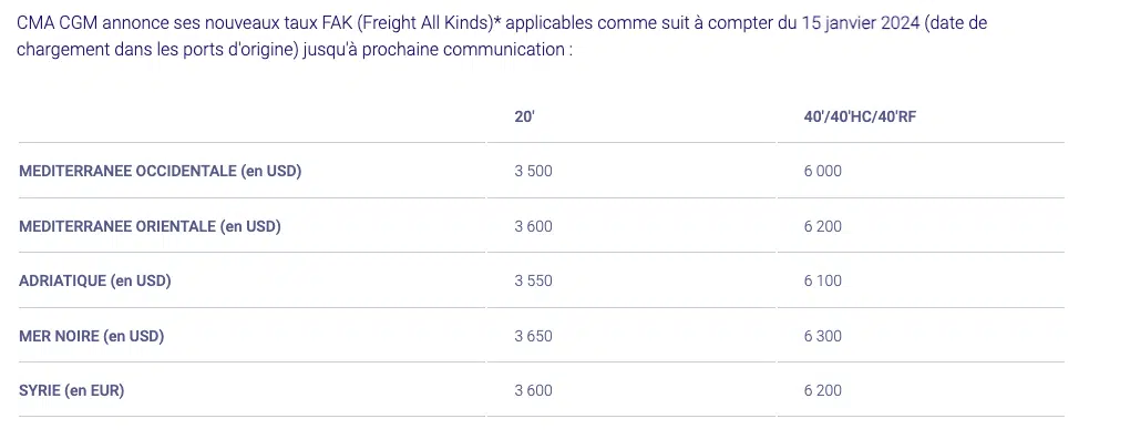 L'armateur français CMA-CGM a annoncé sa nouvelle grille tarifaire pour le transport des conteneurs 20 et 40 pieds, dans un communiqué publié le 2 janvier. Les tarifs passent de 3.000 à plus de 6.000 $ pour le 40 pieds, et de 2.000 à plus de 3.500 $ pour le 20 pieds.