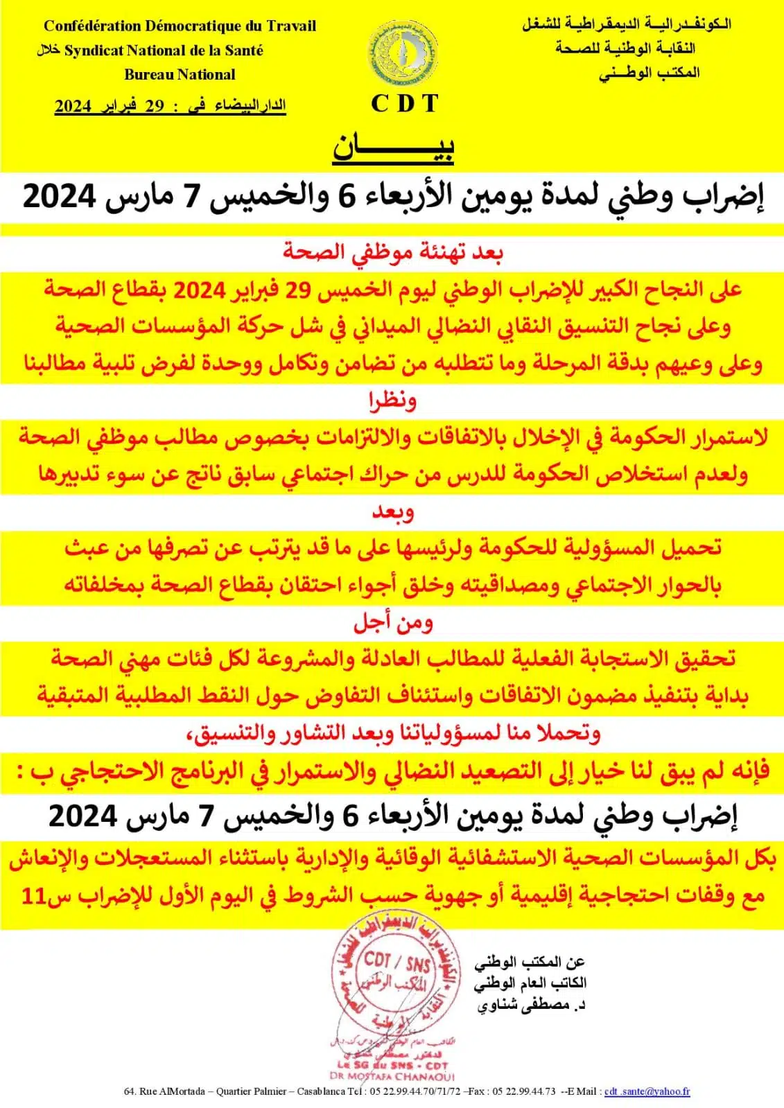 "Nous décrétons ainsi une grève nationale de deux jours les mercredi 6 et jeudi 7 mars 2024 dans tous les établissements hospitaliers et administrations, à l’exception des urgences, de la réanimation et des soins intensifs, avec des sit-in provinciaux et régionaux", conclut le document.