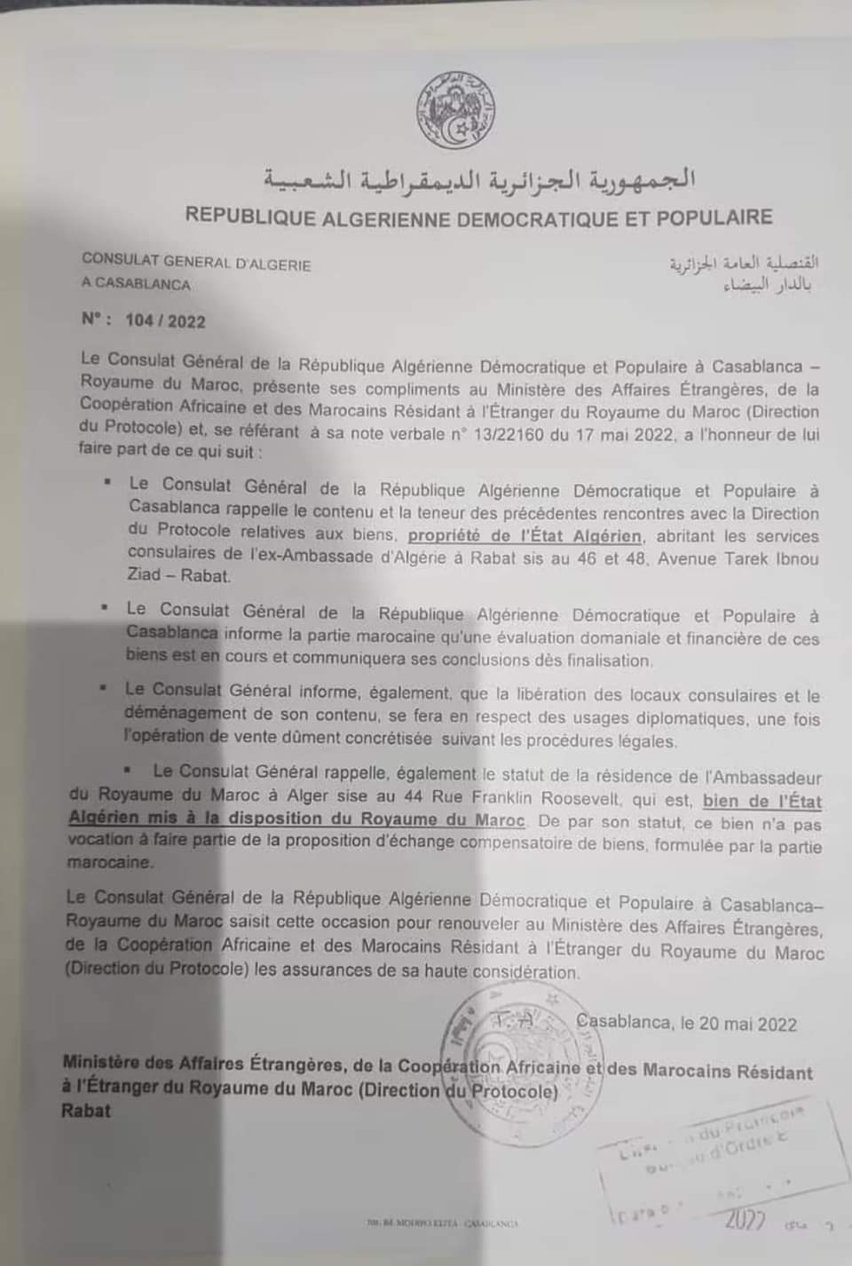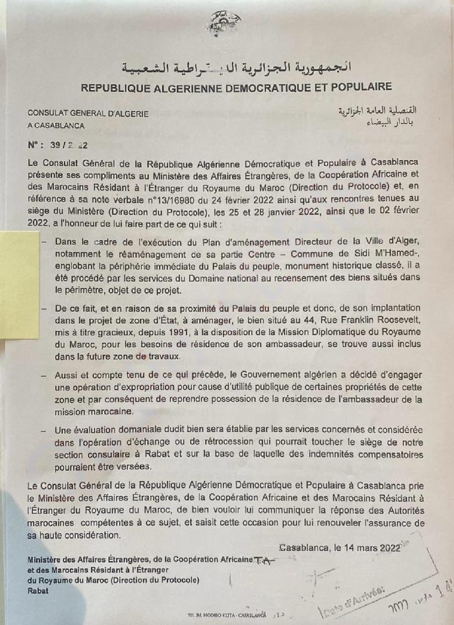 Alors que les autorités algériennes prétendent avoir été surprises par la procédure d'expropriation initiée par le Maroc concernant une propriété foncière appartenant à l'État algérien, des documents officiels prouvent le contraire. L'Algérie était pleinement consciente de cette situation à laquelle elle a apporté sa coopération, tout en entamant la même procédure concernant la résidence de l'ambassadeur du Maroc à Alger.