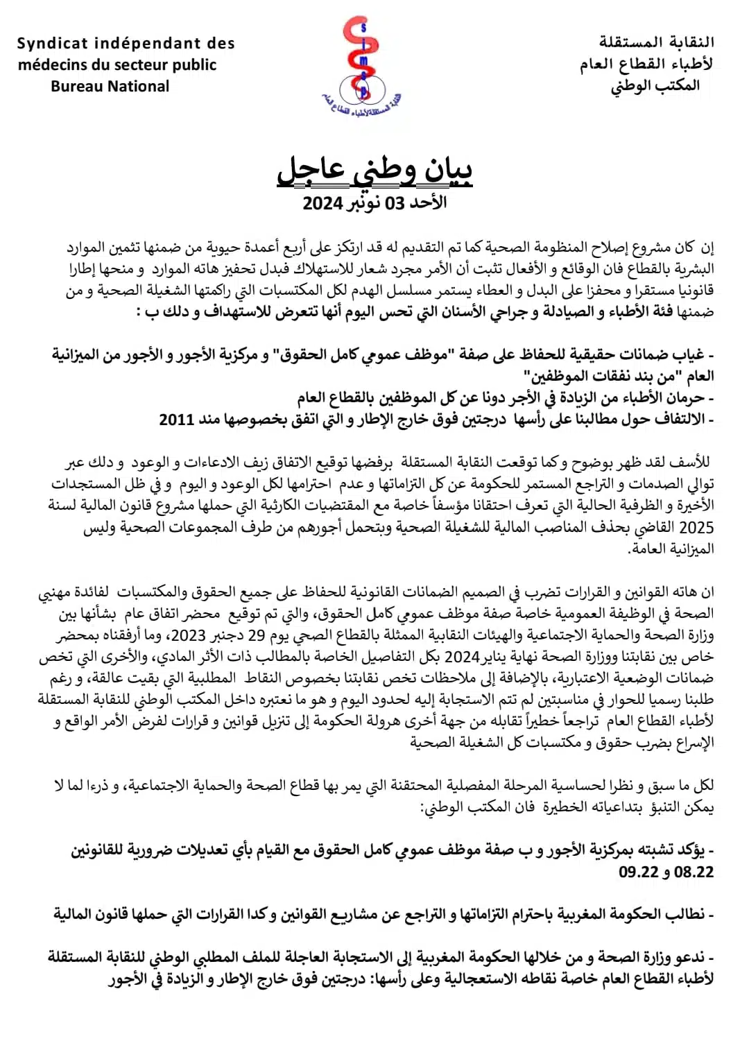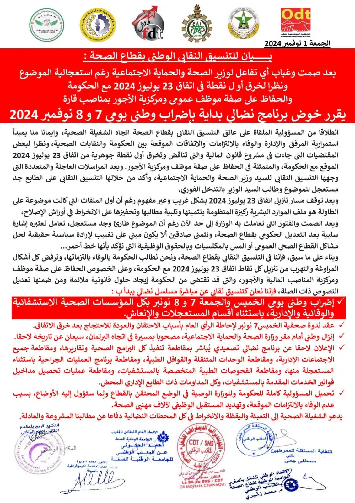 Depuis son arrivée à la tête du ministère, ce dernier a été sollicité à deux reprises par ladite coordination et par d'autres syndicats, non pas pour une prise de contact, mais au sujet d’un dossier que les professionnels du secteur jugent urgent, celui des dispositions du projet de loi des finances au titre de l’année 2025 (PLF 2025), qui touchent à leurs acquis. Deux courriers à caractère "urgent" ont dans ce sens été adressés au nouveau ministre les 20 et 25 octobre derniers par la coordination syndicale de santé, qui sont "restés sans réponse", selon des membres de la coordination.